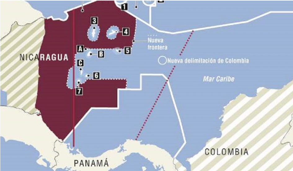 Mais le régime d’Ortega ne se limite pas aux frontières terrestres, il utilise aussi les conflits liés aux frontières maritimes. On a l’exemple de la Colombie avec qui les délimitations maritimes dans la mer des Caraïbes sont historiquement contestées. Le Nicaragua a saisi la Cour de La Haye pour contester la souveraineté colombienne sur un vaste secteur maritime et sur l’archipel de San Andrés et Providencia venant ainsi exploiter le droit international et plus particulièrement utiliser les décisions de la Cour Internationale de Justice à son avantage comme preuve de restauration de la souveraineté nationale face à un ennemi historique, comme la Colombie (Angulo Cardona et al., 2021). Ces litiges ont donné lieu à plusieurs décisions de la Cour. Les jugements favorables au Nicaragua, qui lui ont par exemple octroyé